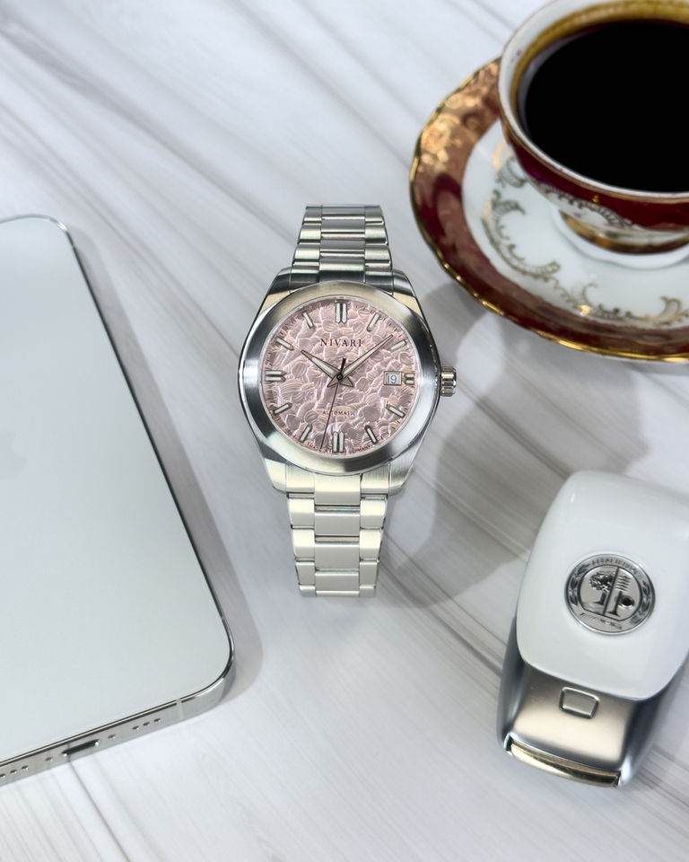 Delicate yet precise — the Sakura dial, in soft pastel pink, captures the fleeting beauty of cherry blossoms in full bloom. Fine textures gently catch the light, revealing shifting patterns of depth and shadow — like petals moving in the wind. A poetic moment of nature, brought to the wrist.
